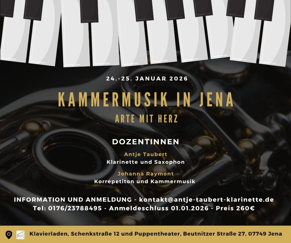 Am 24. und 25. Januar 2026 durfte ich mit großer Freude ein Kammermusikwochenende in den wunderbaren Räumlichkeiten von Jena Puppets und dem Klavierladen Jena gestalten. Im Puppentheater gab es sofort eine Atmosphäre zum Wohlfühlen, Ankommen und gemeinsamen Musizieren. Die liebevollen Inhaber des Klavierladens Jena: Martin Kuntze und Nina Bangerter bereiteten uns einen Ort vor, in dem zwischen Flügeln und Holz voller Klang entstand. Denn am Flügel saß Johanna Raymont – angereist aus München und sie probte mit den Teilnehmenden individuell.