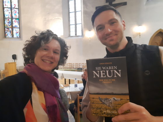 Auf dem Foto sind Fabian und ich mit dem Buch „Sie waren neun. Der Weg in die Freiheit“ von Gwen Strauss in der Hand.