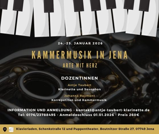 Am 24. und 25. Januar 2026 durfte ich mit großer Freude ein Kammermusikwochenende in den wunderbaren Räumlichkeiten von Jena Puppets und dem Klavierladen Jena gestalten. Im Puppentheater gab es sofort eine Atmosphäre zum Wohlfühlen, Ankommen und gemeinsamen Musizieren. Die liebevollen Inhaber des Klavierladens Jena: Martin Kuntze und Nina Bangerter bereiteten uns einen Ort vor, in dem zwischen Flügeln und Holz voller Klang entstand. Denn am Flügel saß Johanna Raymont – angereist aus München und sie probte mit den Teilnehmenden individuell.