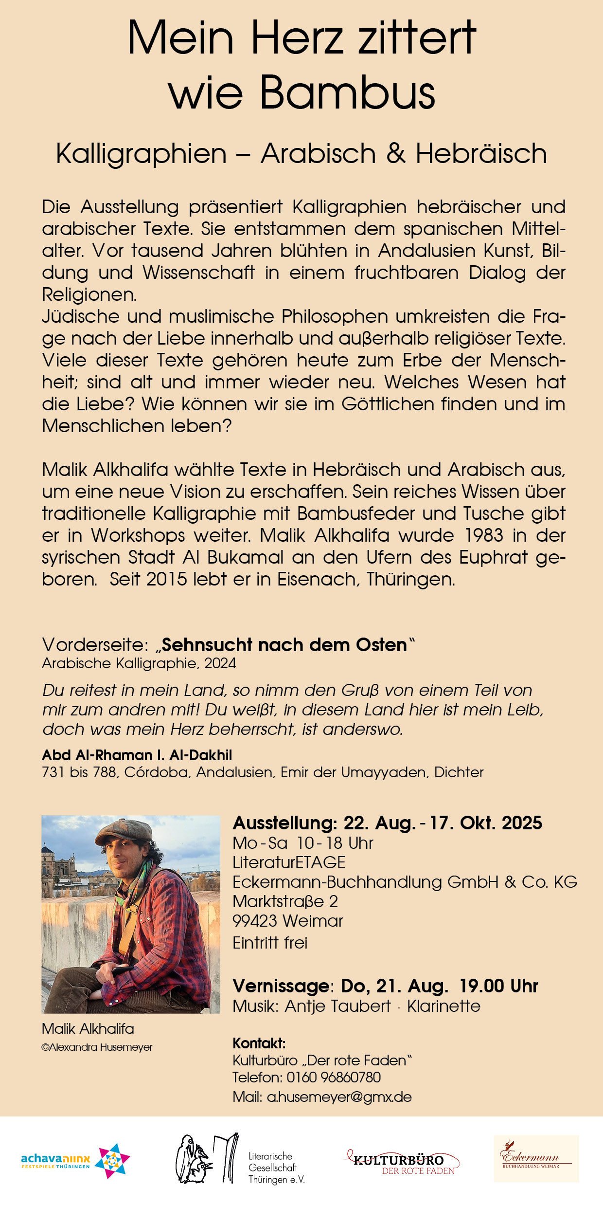Vernissage mit Musik Malik Alkhalifa 21. August 2025 19:00 Weimar Ort: Eckermann-Buchhandlung GmbH & Co KG, Marktstr. 2, 99423 Weimar